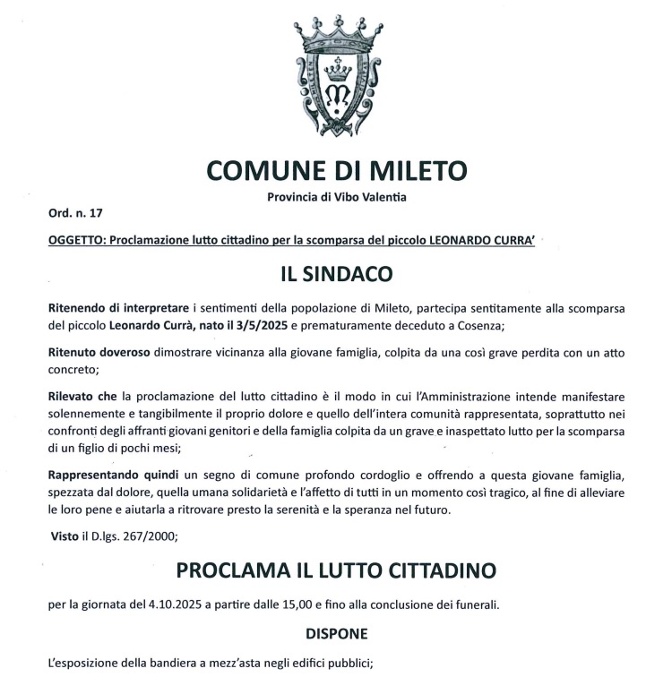 La morte del piccolo Leonardo ha colpito tutti. Tanti, in queste ore di profondo dolore, i messaggi di vicinanza alla mamma Katia, al papà Gianluca e a tutta la famiglia. Profondo il dolore nell’intera comunità di Mileto dove oggi come ha già annunciato nei giorni scorsi il sindaco Salvatore Fortunato Giordano sarà lutto cittadino.
