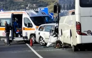 Nell’incidente sono rimasti coinvolti un pullman ed un’automobile che, per cause in corso d’accertamento, si sono scontrati frontalmente.