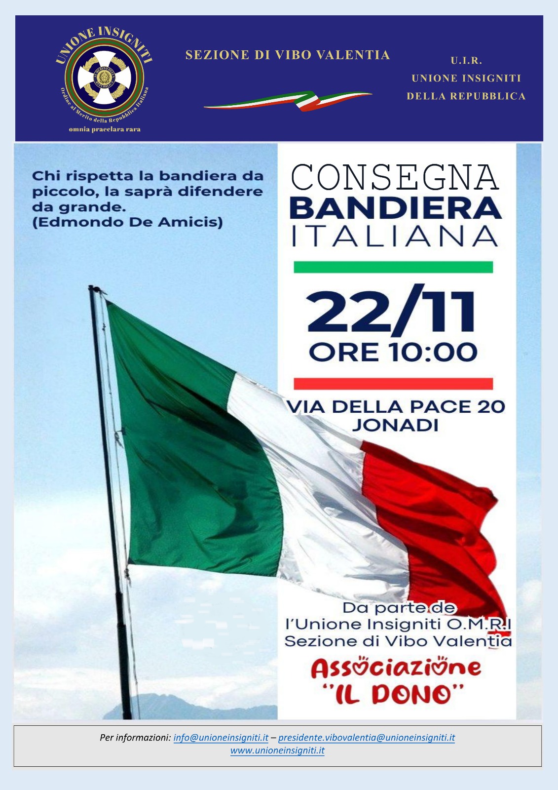 Parte da un’intensa frase di Edmondo De Amicis – “Chi rispetta la bandiera da piccolo, la saprà difendere da grande – l’iniziativa che caratterizzerà la mattinata di sabato prossimo. Un gesto di profonda solidarietà e alto valore simbolico caratterizzerà l’incontro tra la Sezione territoriale di Vibo Valentia dell’Unione Insigniti Ordine al Merito della Repubblica Italiana (U.I.R.) e l’associazione “Il Dono”, centro diurno per l’accoglienza di persone con disabilità.