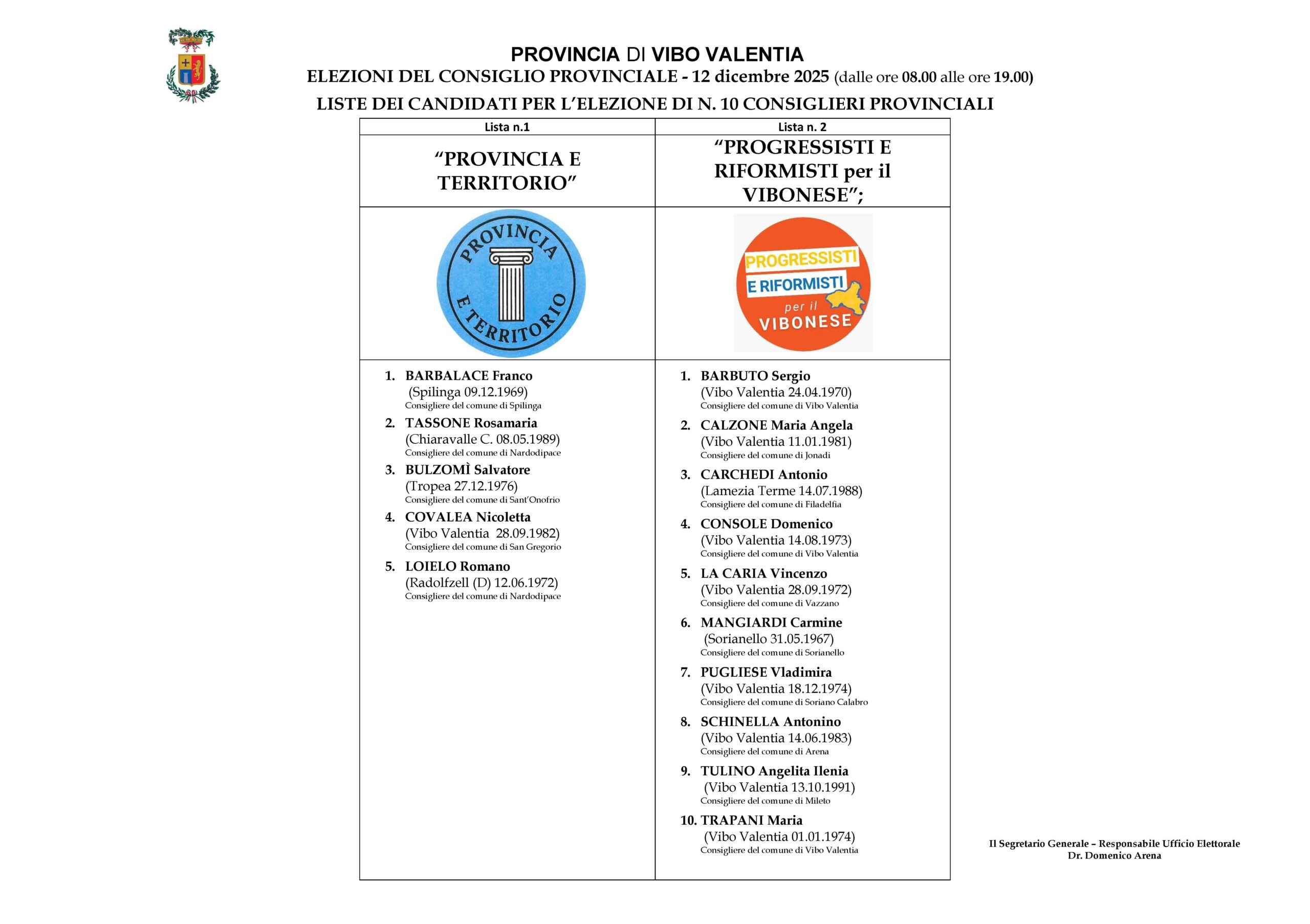 La lista numero 1 è associata alla compagine elettorale denominata: “Provincia e Territorio”. La lista numero 2 a quella denominata: “Progressisti e Riformisti per il Vibonese”.