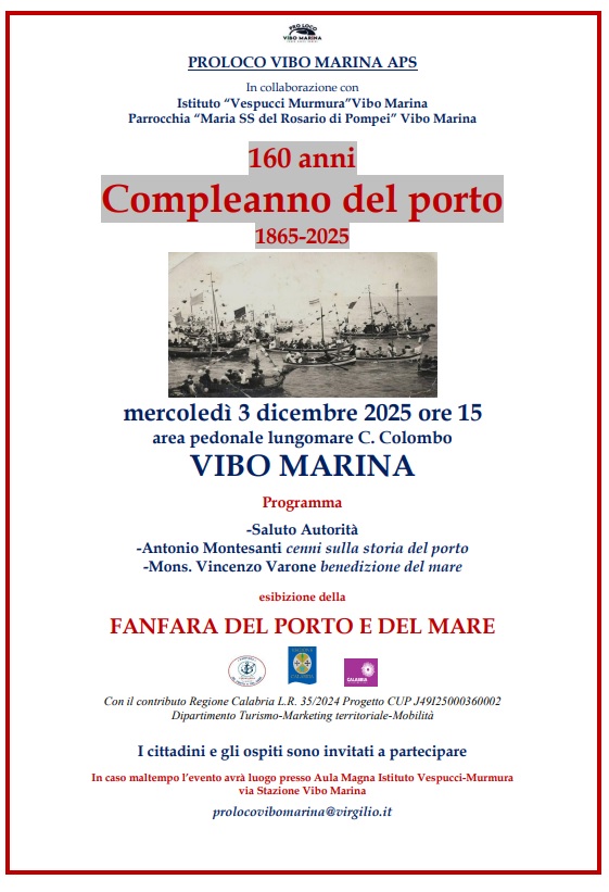 Giorno 3 dicembre 2025 alle ore 15, nella zona pedonale del lungomare Cristoforo Colombo, vi sarà una breve cerimonia per il “Compleanno del Porto” con i suoi 160 anni di attività, organizzato dalla Pro Loco, in collaborazione con Istituto Vespucci-Murmura e la Parrocchia Maria SS del Rosario di Vibo Marina.
