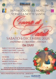 Il Lions Club Cosenza “Castello Svevo”, insieme all’ Accademia musicale “G. Rossini”, al Convegno di Cultura “Maria Cristina di Savoia” di Cosenza e alla associazione “Confluenze” organizza per domani sabato 6 dicembre, alle ore 19,30, presso il Santuario del SS. Crocifisso di Cosenza, il tradizionale Concerto di Natale, un evento di grande valore artistico e umano, finalizzato alla beneficenza.