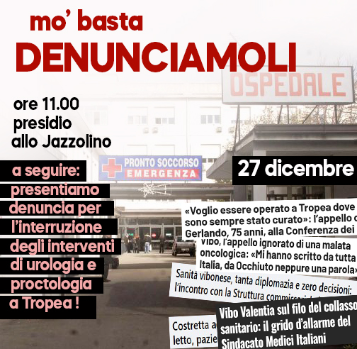 La protesta avrà un nuovo momento clou sabato 27 dicembre. Dopo il consueto sit-in allo Jazzolino, i manifestanti si recheranno al Comando provinciale dei Carabinieri per depositare denunce per interruzione di pubblico servizio. Nel mirino, in particolare, la sospensione dell’attività operatoria di urologia e proctologia dell’ospedale di Tropea, causata dalla grave carenza di anestesisti. Una situazione che, secondo i promotori, potrebbe essere riconducibile a condotte omissive o inadempienti.