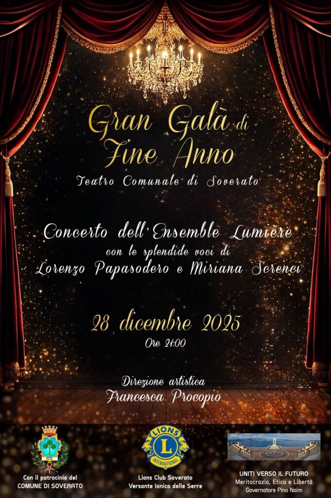 Lo splendore del Natale di Soverato si arricchisce di una nuova, preziosa iniziativa all’insegna della cultura e della solidarietà. Sabato 28 dicembre, alle ore 21.00, il Teatro Comunale ospiterà il “Gran Galà di fine anno”, evento organizzato dal Lions Club Soverato Versante Jonico delle Serre, destinato a regalare al pubblico una serata di grande musica e profondo valore umano.