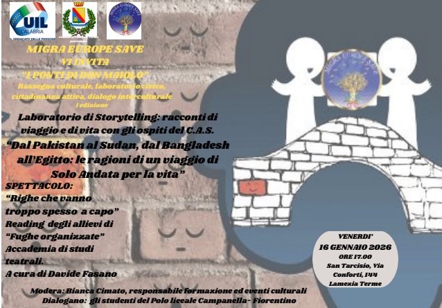 Racconti di partenze senza ritorno, di speranze affidate al viaggio e di vite che cercano un futuro possibile. È questo il cuore de “I Ponti di Don Maiolo”, rassegna culturale e laboratorio civico promossi da Migra Europe Save, che venerdì 16 gennaio alle ore 17.00, si terrà a Lamezia Terme, nei locali di San Tarcisio, in via Conforti 144 invito II evento.