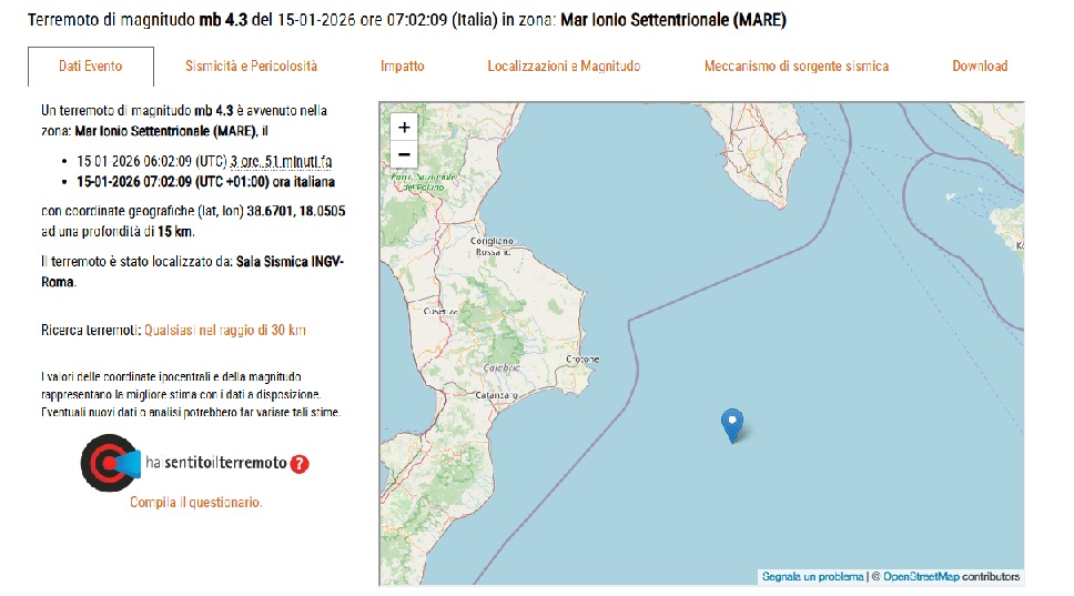 Altri due terremoti avvenuti questa mattina nel Mar Ionio Settentrionale, hanno creato tensione in terra calabra, il primo, in particolare, di magnitudo 4.3, è stato registrato dalla Sala Sismica INGV-Roma, alle 7:02 ad una profondità di 15 km al largo della costa crotonese.