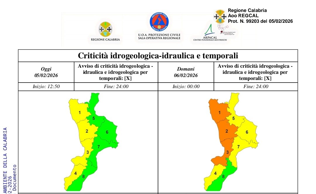 Nuova allerta arancione in Calabria che questa volta coinvolge anche il territorio della provincia di Vibo Valentia per cui visto che il Dipartimento della Protezione Civile della Regione Calabria, con nota AOO REGCAL Prot. n. 99203 del 05/02/2026, ha diramato il bollettino di criticità meteorologica, prevedendo per il territorio comunale un livello di allertamento ARANCIONE per condizioni meteorologiche avverse per l’intera giornata di domani, venerdì 6 febbraio 2026 e considerato che tali previsioni segnalano fenomeni di particolare intensità, tra cui precipitazioni diffuse e forti raffiche di vento, tali da configurare un potenziale pericolo per la pubblica e privata incolumità, il sindaco di Vibo Valentia ha firmato un’ordinanza con la quale ha ritenuto di dover adottare, in via prudenziale e con estrema urgenza, misure contingibili atte a mitigare i rischi derivanti dalla circolazione stradale e dalla frequentazione di luoghi aperti al pubblico, disponendo la chiusura degli istituti scolastici, dei parchi e dei cimiteri comunali.