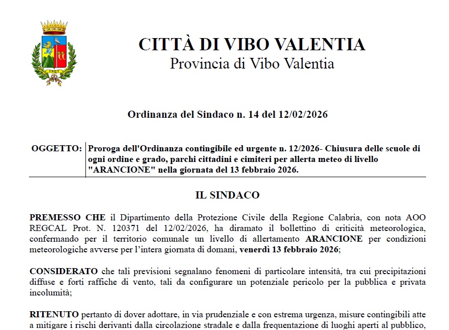 Il provvedimento, che proroga l’ordinanza contingibile e urgente n. 12/2026, sarà in vigore fino a cessata emergenza, salvo ulteriori estensioni in base all’evoluzione delle condizioni meteo. Il sindaco ha inoltre disposto l’immediata trasmissione dell’ordinanza alla Prefettura, all’Ufficio Scolastico Regionale, alla Protezione Civile e agli organi di stampa, affinché l’informazione raggiunga tempestivamente la cittadinanza.