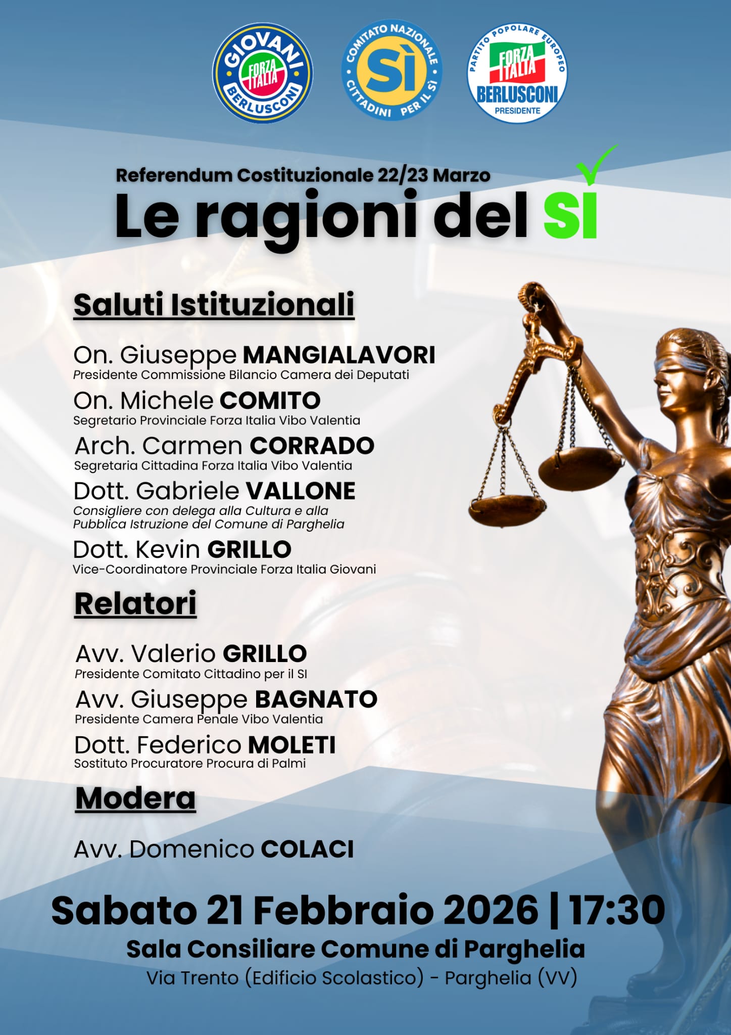 Un appuntamento per approfondire le ragioni della riforma e promuovere una scelta consapevole. Sabato 21 febbraio 2026, alle ore 17:30, la Sala Consiliare del Comune di Parghelia ospiterà un dibattito pubblico organizzato da Forza Italia insieme al Comitato del SÌ.