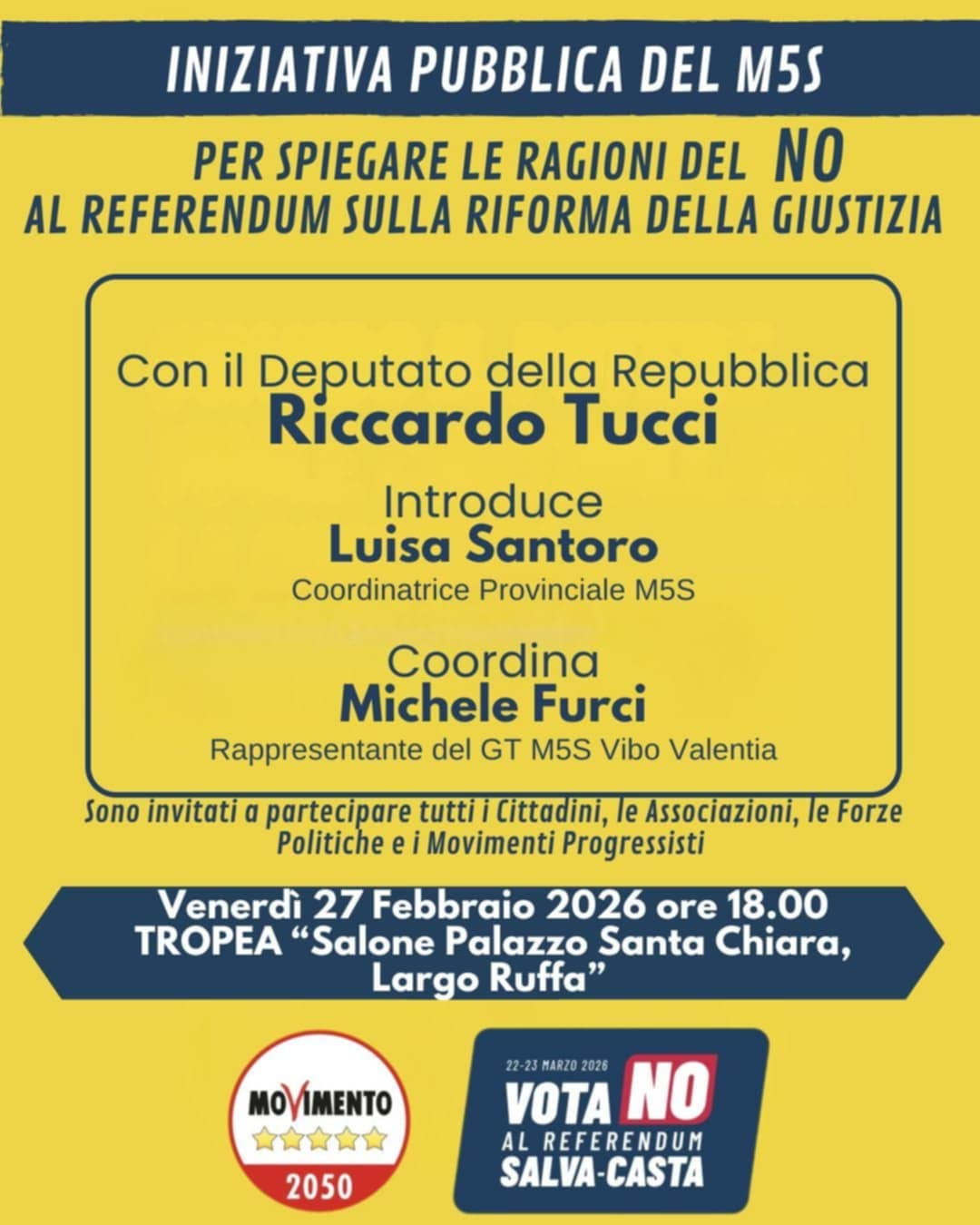 Il M5S di Vibo Valentia, nell’ambito della campagna informativa in vista del voto referendario del 22 e 23 marzo, venerdì 27 febbraio alle ore 18,00 terrà un primo incontro a Tropea, presso il salone dell’ex Convento di Santa Chiara posto nel Largo Ruffa per spiegare tra gli altri i suoi principali motivi per votare No.