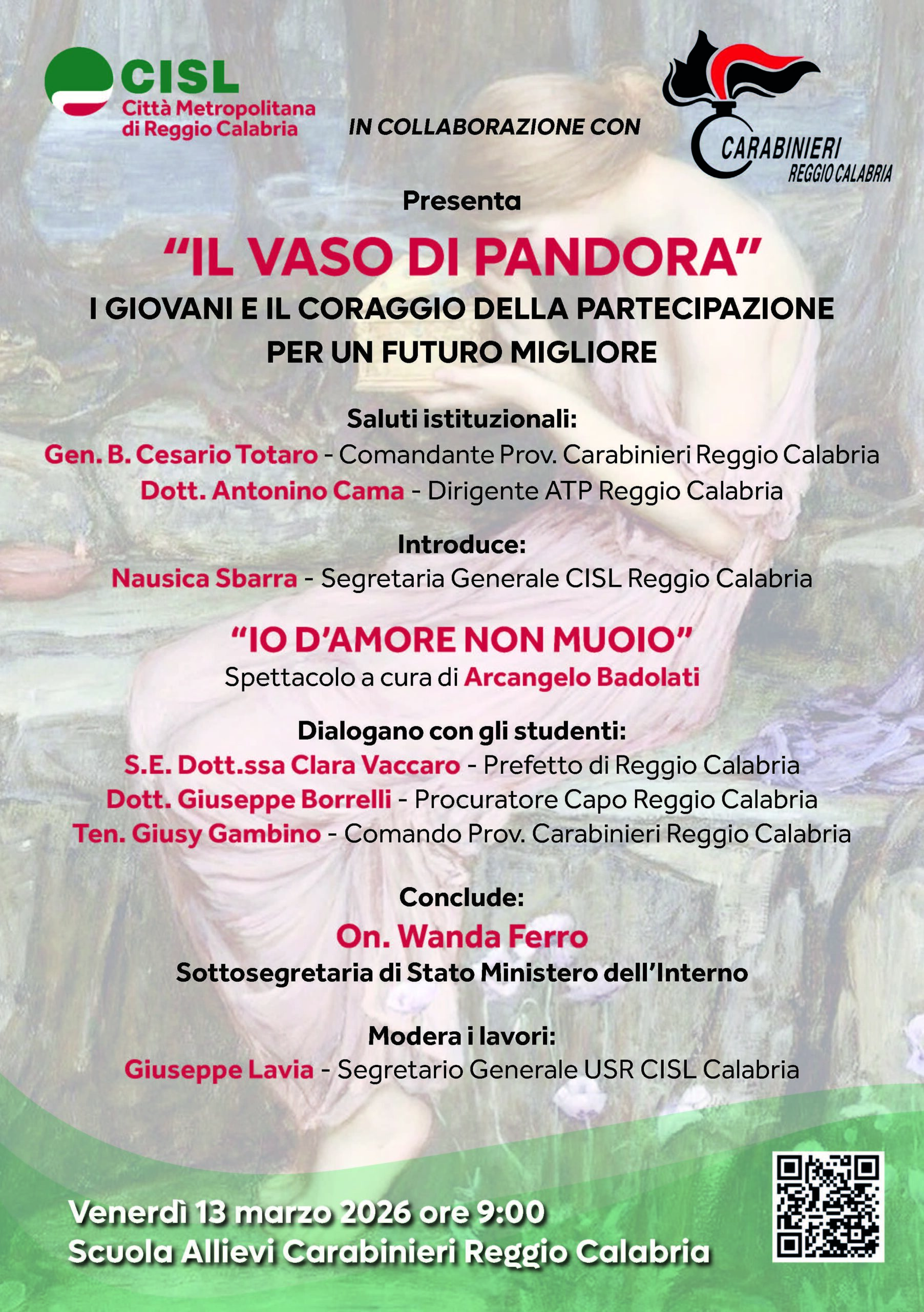 Reggio Calabria si prepara ad ospitare un importante momento di confronto dedicato alle nuove generazioni, che si terrà domani, alle ore 9.00, presso la Scuola Allievi Carabinieri di Reggio Calabria, l’iniziativa “Il Vaso di Pandora – I giovani e il coraggio della partecipazione per un futuro migliore”, è promossa dalla CISL della Città Metropolitana di Reggio Calabria in collaborazione con il Comando Provinciale dei Carabinieri.