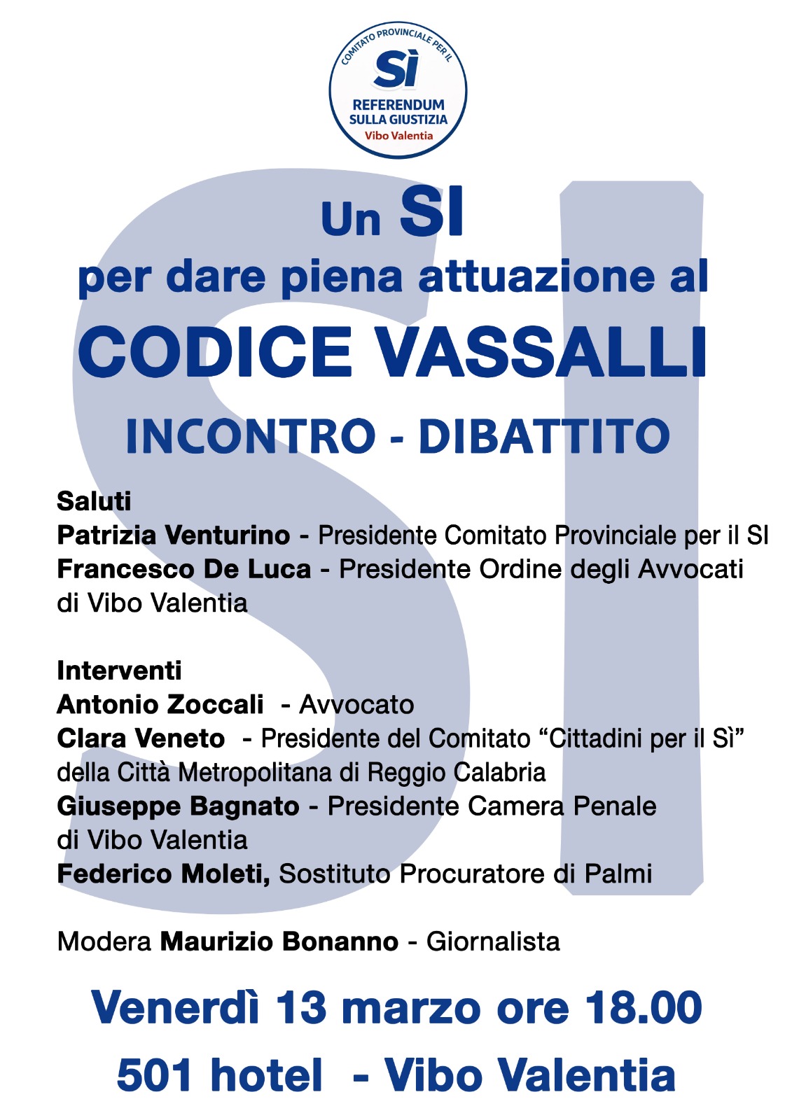 Un momento di confronto pubblico su uno dei temi più delicati e centrali per la democrazia italiana: la riforma della giustizia e l’attuazione del cosiddetto “Codice Vassalli”. È questo l’obiettivo dell’incontro–dibattito promosso dal Comitato Provinciale per il Sì al referendum sulla giustizia, in programma venerdì 13 marzo alle ore 18.00 presso il 501 Hotel di Vibo Valentia.