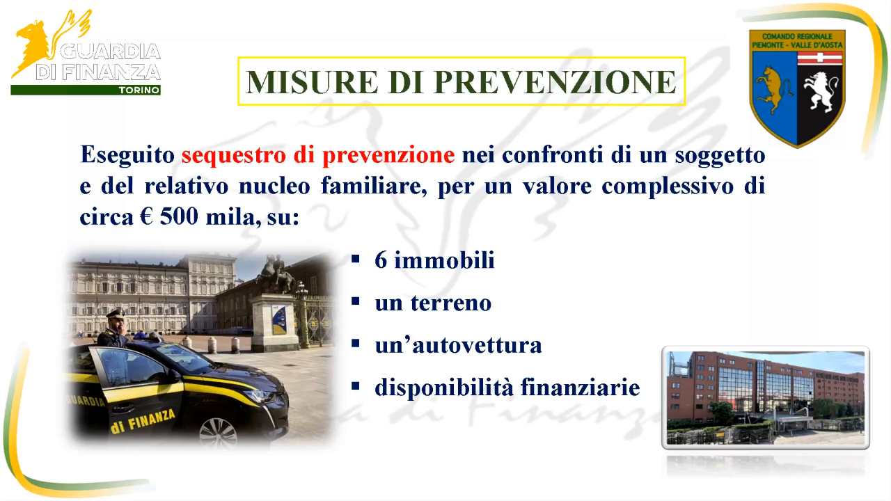 I militari del Comando Provinciale della Guardia di finanza di Torino, sotto il coordinamento della locale Procura della Repubblica – D.D.A., ha dato esecuzione a un decreto di sequestro finalizzato alla confisca di prevenzione emesso dalla Sezione Misure di Prevenzione del Tribunale di Torino di disponibilità finanziarie e immobiliari per circa mezzo milione di euro, nei confronti di una persona condannata anche per reati di associazione di tipo ndranghetista ipotizzando una sua costante pericolosità sociale.