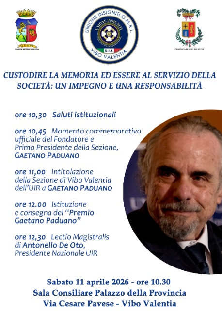 Un appuntamento di alto profilo istituzionale e civile quello in programma sabato 11 aprile 2026 alle ore 10.30, presso la Sala Consiliare del Palazzo della Provincia di Vibo Valentia, dove l’Unione Insigniti al Merito della Repubblica Italiana (UIR) – sezione di Vibo Valentia – celebrerà la memoria del proprio Fondatore e Primo Presidente, Gaetano Paduano.