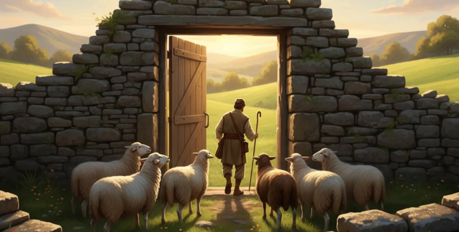 Di notte, le pecore venivano raccolte in un recinto, all’aperto, circondato da mura di pietra a secco per proteggerle, così, nelle ore notturne, da ladri, lupi, Iene, sciacalli. Nell’ovile, i vari proprietari, nelle campagne palestinesi, raccoglievano le loro pecore in spazi interni divisi e marchiate a fuoco per consentirne il riconoscimento. All’alba, ogni pastore, si presentava alla porta dell’ovile, custodito da uno o più guardiani e ritirava il proprio gregge per condurlo al pascolo. Una volta riunito il gregge, il pastore si metteva alla testa del gregge stesso che docile lo seguiva. Iniziava, così, la lunga giornata, vagando per valli e colline, fino al calar del sole, quando le pecore, di ritorno, alla porta dell’ovile, venivano munte e poi rinchiuse al sicuro. Gesù, su ispirazione di queste immagini bucoliche, ci dice che Lui è il bel pastore e, nello stesso tempo, é la porta, attraverso la quale si entra e si esce con sicurezza.